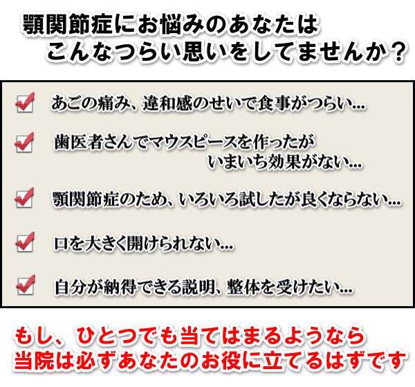 一般的な顎関節症の治療は、あごに負担をかけている「原因」に対しては全く治療されていないからです。