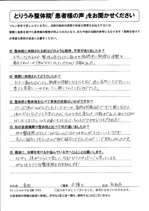 今まで整体院=”痛くされる”という先入観のもと避けて来た様に思います。しかし、とりうみ整体院のホームページを見て初めて施術を受けてみようという気持ちになりました。