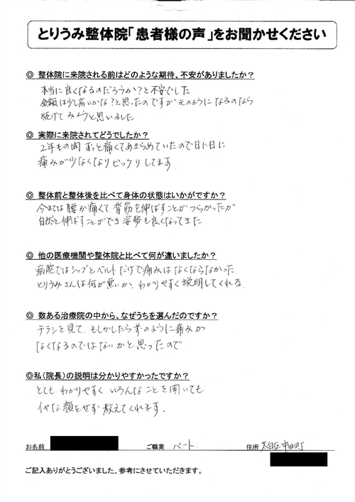 整体前は痛みで日常生活に支障がありましたが、とりうみ整体に通うようになり、普通に動け生活できるようになりました。