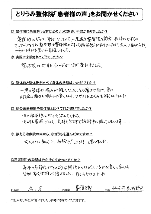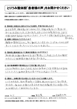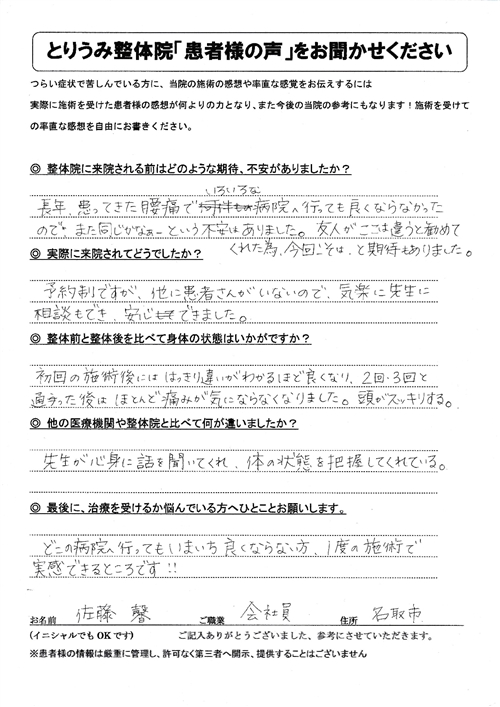 薬を出しますね、と言われるだけで根本的な改善になりませんでした。とりうみ整体院で見て貰ってからは自分の身体の構造が理解でき、根本的な所から解決することができました。