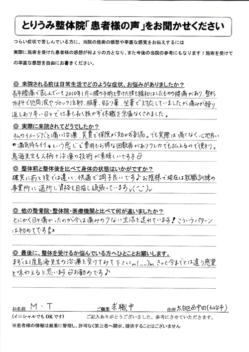 M・Y様 運送業 宮城県M町在住 主訴・腰痛