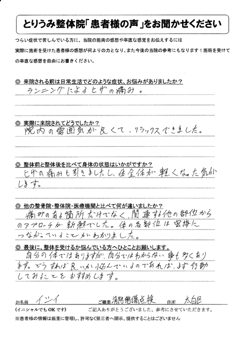 膝の痛みも良くなり、体が軽くなりました